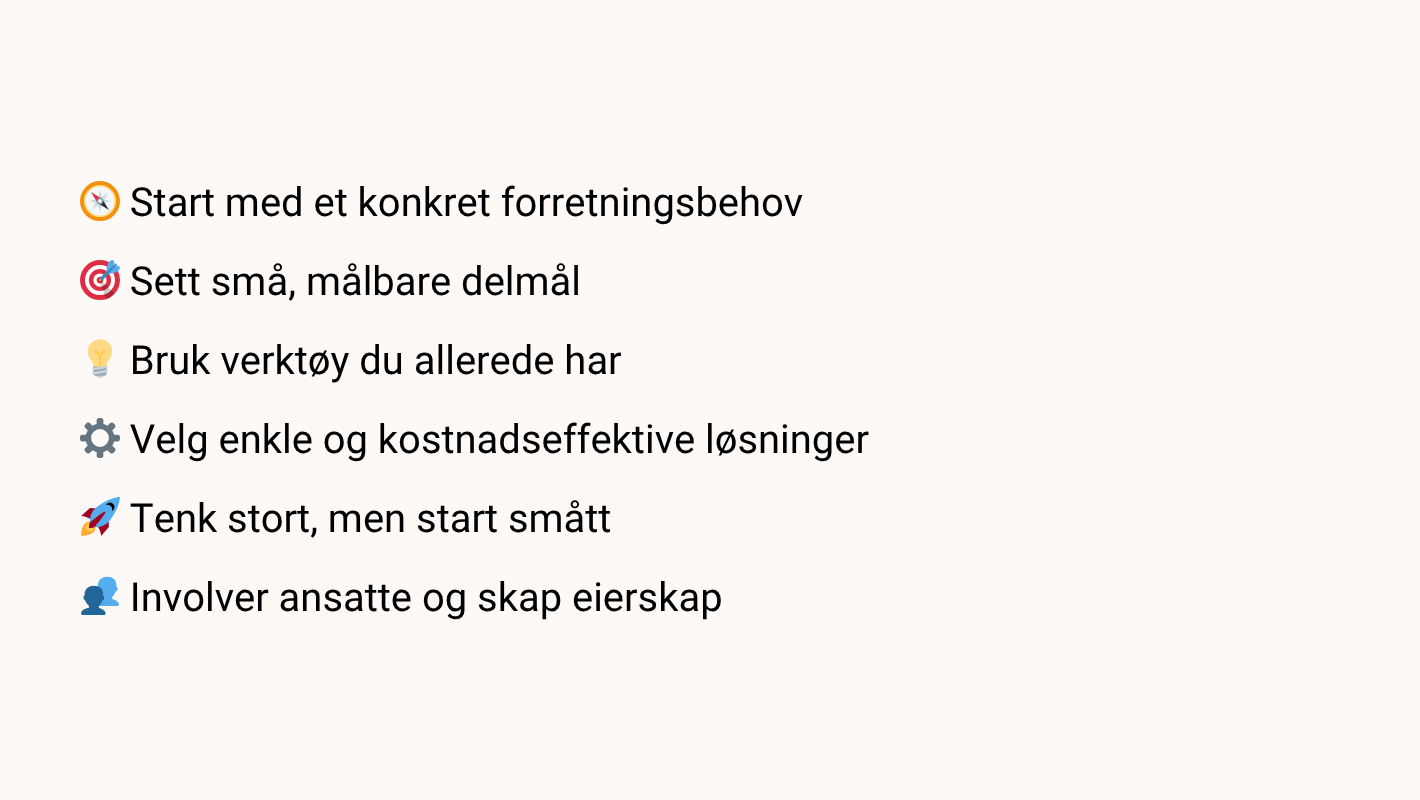 Mange selskaper ønsker å bli mer datadrevne, men starter for stort og for dyrt. I denne artikkelen får du noen praktiske råd for hvordan du kan starte en datasatsing med et konkret forretningsbehov, teste verdi gjennom pilotprosjekter og bygge videre uten å kjøpe en full plattform fra dag en.